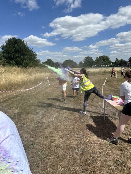 The highlight of the afternoon was a 0.75-mile colour course, which students could walk or run as many times as they wished in 20 minutes. Along the route, five vibrant stations were set up where staff cheerfully showered pupils with colourful powder. As the air filled with bright hues, music kept spirits high—complete with impromptu dance breaks for the Macarena!